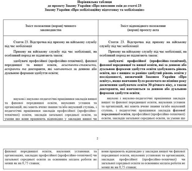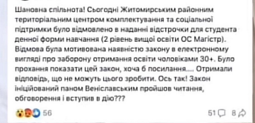 «У Верховній Раді зареєстрували законопроєкт, який передбачає внесення змін до закону "Про мобілізаційну підготовку та мобілізацію" щодо скасування відстрочки для деяких студентів. Жителі Житомирщини скаржаться, начебто Житомирський районний ТЦК та СП відмовляє у відстрочці від мобілізації студентам магістратури денної форми навчання. Студентам вручають повістку та направляють для проходження військово-лікарської комісії. Зміни до Закону не прийняті, а громадянам вручають повістки для того, щоб вони оновили дані та підтвердили факт навчання у навчальному закладі. Відповідно до Закону України «Про військовий обов'язок і військову службу» всі хто навчається зобов'язані щороку до 1 жовтня подавати у районні (міські) ТЦК та СП документи, довідку з відповідного навчального закладу», - йдеться у повідомленні.