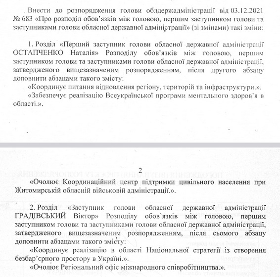 «Розділ «Перший заступник голови обласної державної адміністрації ОСТАПЧЕНКО Наталія Розподілу обов'язків між головою, першим заступником голови та заступниками голови обласної державної адміністрації, після другого абзацу доповнити абзацами такого змісту: «Координує питання відновлення регіону, територій та інфраструктури.», «Забезпечує реалізацію Всеукраїнської програми ментального здоров'я в області.», «Очолює Координаційний центр підтримки цивільного населення при Житомирській обласній військовій адміністрації.», - йдеться у документі.