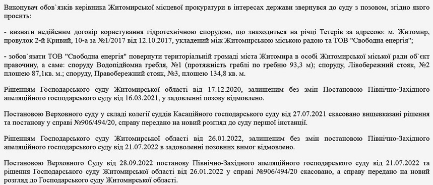Зауважимо, що прокуратура судиться за житомирську греблю з 2020 року, і двічі Верховний суд повертав справу на повторний розгляд до суду першої інстанції: