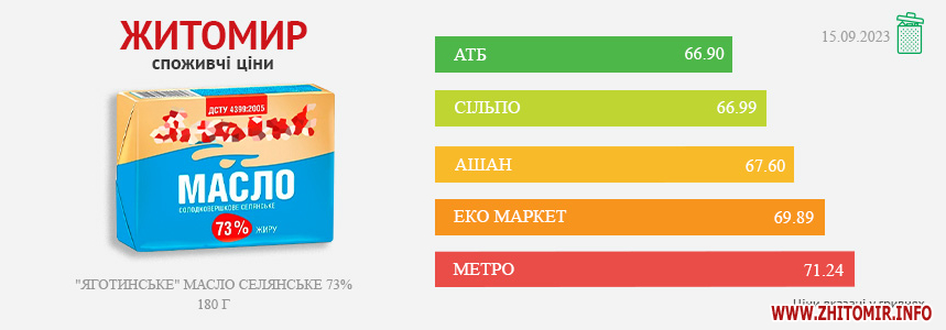 Моніторинг здійснено на основі інформації, отриманої за методом контрольної закупки 15.09.2023 р. у місцях продажу: АТБ, пр. Миру, 15 А, Ашан, вул. Київська, 77, Метро, вул. Ватутіна, 55-в, Сільпо, пл. Житній ринок, 1, Еко Маркет, вул. М. Бердичівська, 2/7