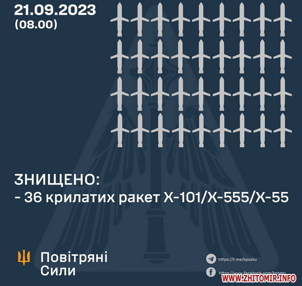 Уночі 21 вересня близько 3.40 російські окупанти атакували Україні крилатими ракетами повітряного базування Х-101/Х-555/Х-55. Усього зафіксовано пуски 43 крилатих ракет із 10 літаків стратегічної авіації Т-95мс з району західніше Енгельса.