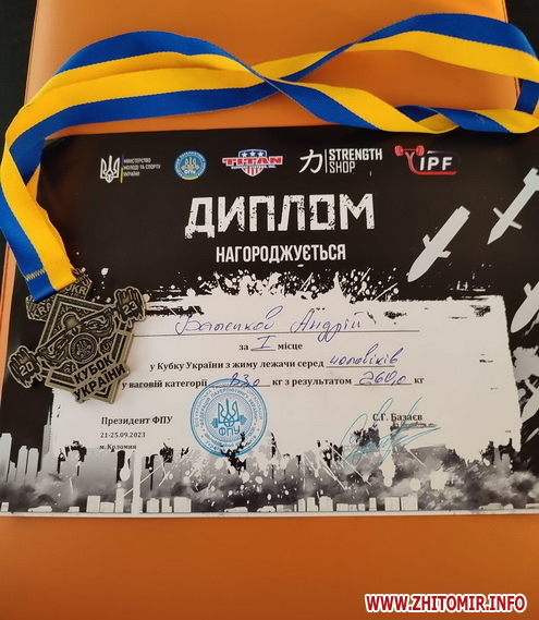 «Голова Федерації з пауерліфтингу в Житомирській області Андрій Баленков виборов звання переможця Кубку України з жиму лежачи серед чоловіків. 260 кг - результат, який приніс спортсмену першість на українській спортивній арені та перепустку на Чемпіонат Світу», - йдеться у повідомленні