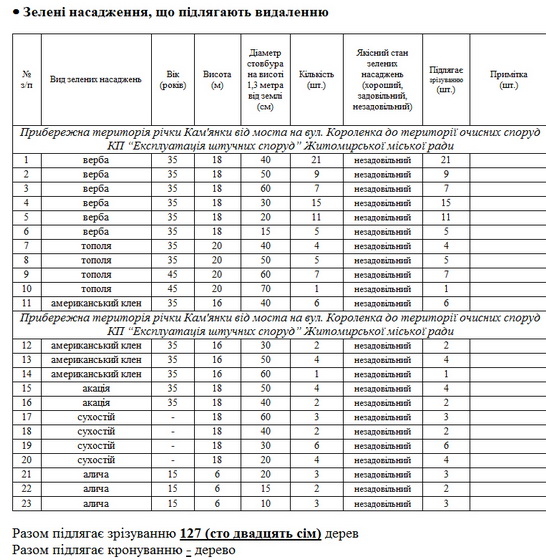 Виконавчий комітет Житомирської міської ради погодив видалення ще 127 зелених насаджень вздовж річки Кам’янка.