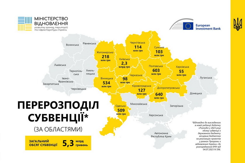 «Джерелом субвенції є кошти, виділені Європейським інвестиційним банком (ЄІБ) в рамках спільної програми України та ЄІБ «Програма з відновлення України». Згідно з розпорядженням, в рамках Програми було затверджено виділення 5,292 мільярда гривень на фінансування 108 проєктів громад, які пройшли конкурсний відбір за процедурою, погодженою з ЄІБ. Разом з тим, за результатами додаткового відбору, Мінінфраструктури було рекомендовано до фінансування та схвалено Європейським інвестиційним банком ще 33 проєкти, що подавалися органами місцевого самоврядування, місцевими органами виконавчої влади, виконавчими органами сільських, селищних, міських рад територіальних громад. Таким чином загальна сума субвенції в розмірі майже 5,3 мільярда гривень буде перерозподілена на відновлення 141 регіонального проєкту, серед яких: заклади освіти, охорони здоров’я, центри надання адміністративних послуг, об’єкти життєдіяльності населення тощо у Вінницькій, Дніпропетровській, Житомирській, Київській, Кіровоградській, Одеській, Полтавській, Сумській, Харківській, Черкаській та Чернігівській областях», - йдеться у повідомленні.