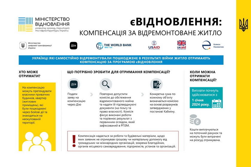 Виплати за новою формою компенсації почнуть здійснюватися з 1 січня 2024 року. Механізм буде таким самим як і по інших категоріях єВідновлення: