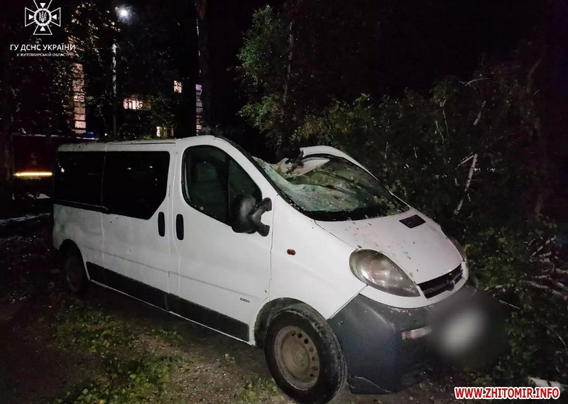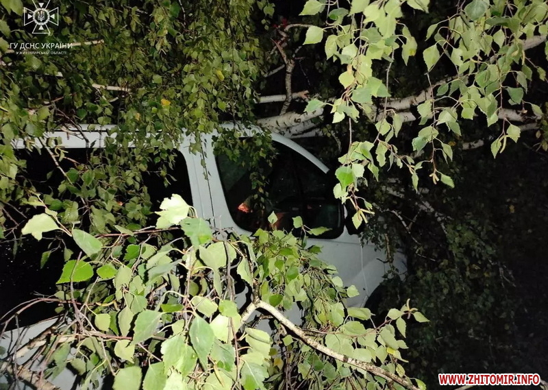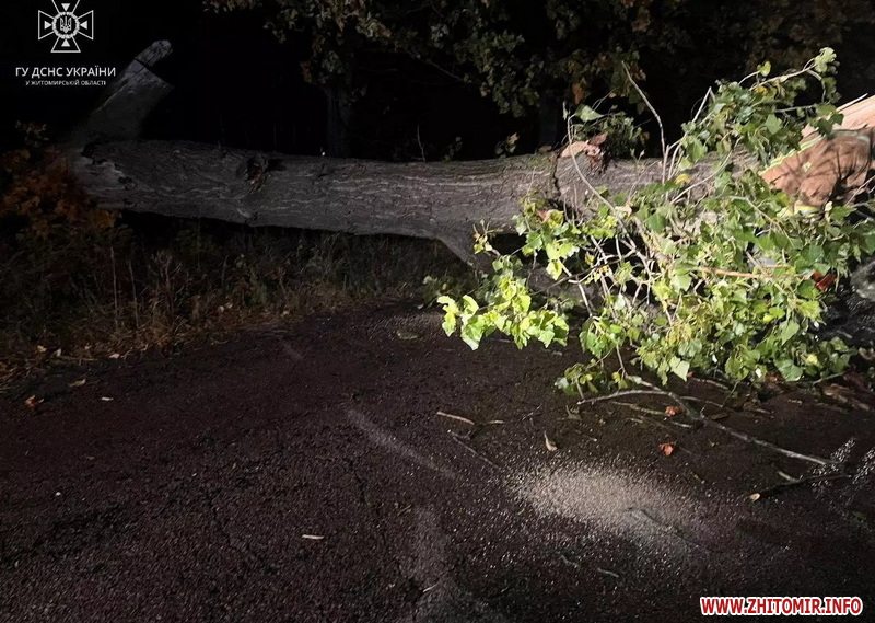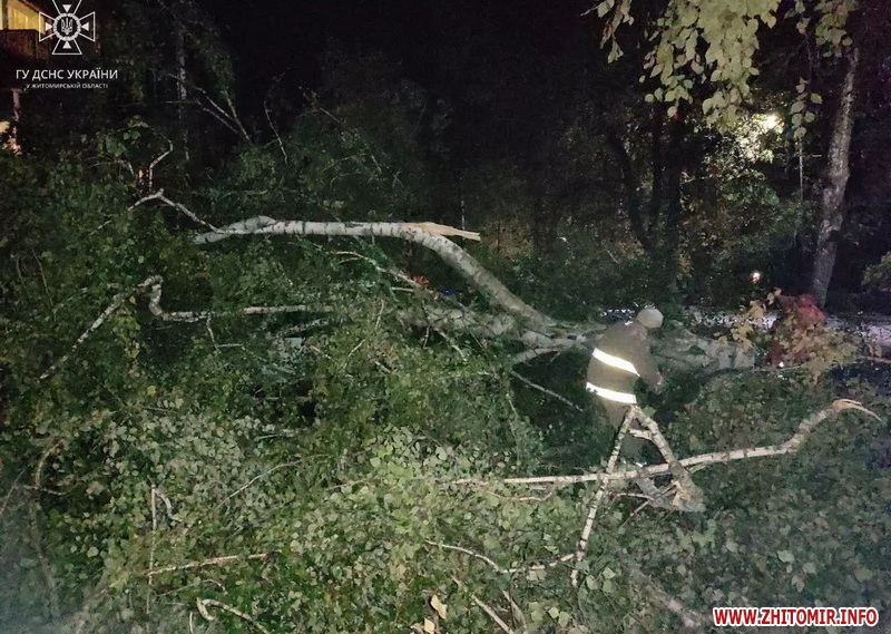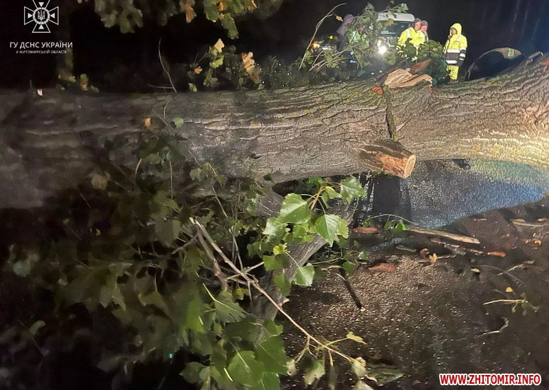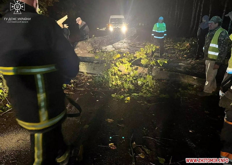«Здебільшого події сталися на території Коростенського району - в Овруцькій, Коростенській та Малинській громадах. А також у селах Колодязьке Коростишівської громади та Горбулів Черняхівської громади, у містах Звягелі та Житомирі. Зокрема, увечері 08 жовтня до Служби порятунку «101» надійшло звернення від органів місцевого самоврядування про необхідність прибрати дерева, які впали на автодорозі біля с.Підруддя Овруцької громади та повністю перекрили рух для транспорту. На допомогу рятувальникам від овруцької громади було залучено трактор. Бійці ДСНС розрізали та розтягнули чотири повалені негодою дерева, і упродовж години проїжджа частина була вже вільною для руху. У м.Звягель бійцями ДСНС проводилися аварійні роботи по прибиранню дерева, яке впало на автомобіль. Подія сталася близько 21:00 на одній із вулиць районного центру. Через сильні пориви вітру у дерева тріснув стовбур і гілля впало на поруч припаркований автомобіль та пробило його покрівлю, також пошкодило лобове скло іншого авто», - йдеться в повідомленні.