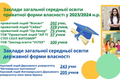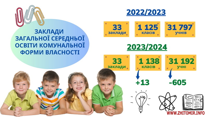 Нагадаємо, середня наповненість класів у житомирських ліцеях зменшилася, однак кількість дітей у кожному близька до 30. Інформацію про мережу житомирських освітніх закладів у 2023/2024 навчальному році 22 вересня оприлюднила пресслужба Житомирської міської ради, посилаючись на дані департаменту освіти.
