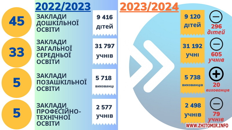 Як повідомляв Житомир.info, з 1 вересня 2023 року в Житомирі 90% дітей навчатимуться офлайн (29 316 учнів), за кордоном залишається понад 3 тисячі учнів.