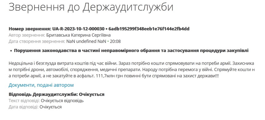 Громадська активістка Катерина Бритавська, яка постійно оскаржує вартісні тендери, через кілька годин після оприлюднення інформації про закупівлю департаменту Житомирської ОДА подала скаргу до Держаудитслужби щодо безглуздого витрачання коштів під час війни.