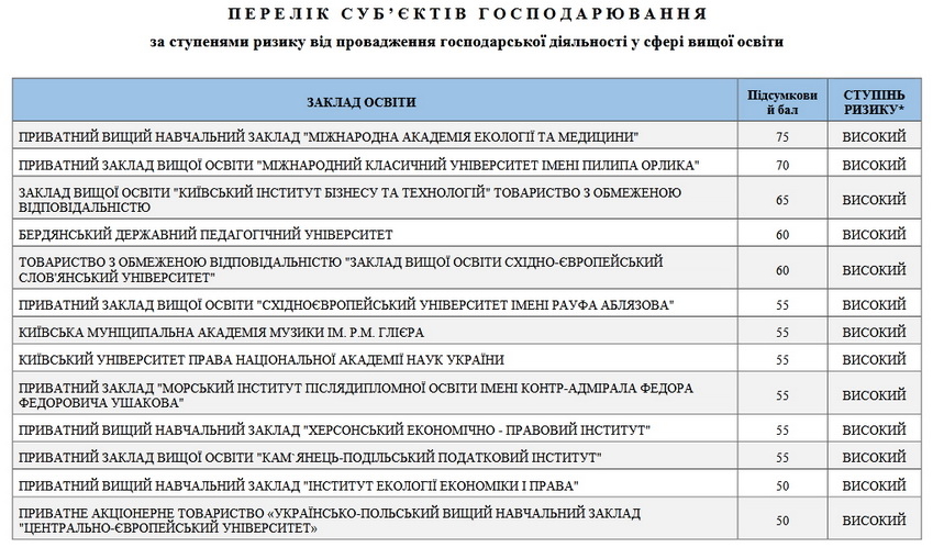 Зазначається, що формування та оприлюднення переліку ЗВО за ступенями ризику має на меті дати змогу звернути увагу на чинники, що збільшують ризики провадження освітньої діяльності, та вжити заходів на запобігання зростання кількості балів за відповідними критеріями.