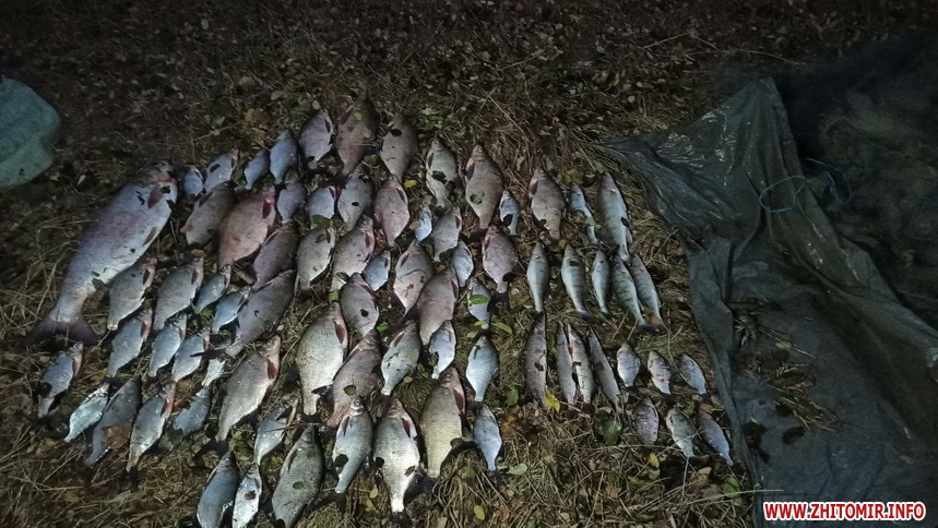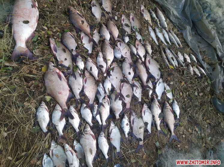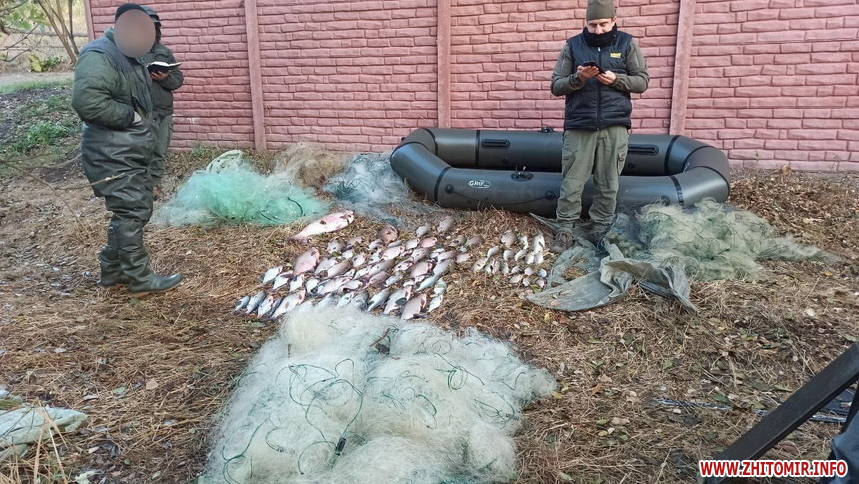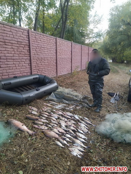 «Інцидент стався на р. Ірпінь (водосховище Корнинське) смт. Корнин Житомирського району Житомирської області. 17 жовтня о 06:00 було виявлено громадянина, який за допомогою заборонених знарядь лову – «сіток» у кількості 7 шт., загальною протяжністю 455 метрів, здійснював незаконне вилучення водних біоресурсів з гумового човна. Зловив рибу: 56 екз. ляща, 5 екз. карася сріблястого, 1 екз. плітки, 7 екз. судака, 7 екз. раків, 4 екз. щуки та 1 екз. товстолоба, загальною вагою 21.9 кг. Сума завданих державі збитків становить 167 756 гривень», - йдеться у повідомленні.