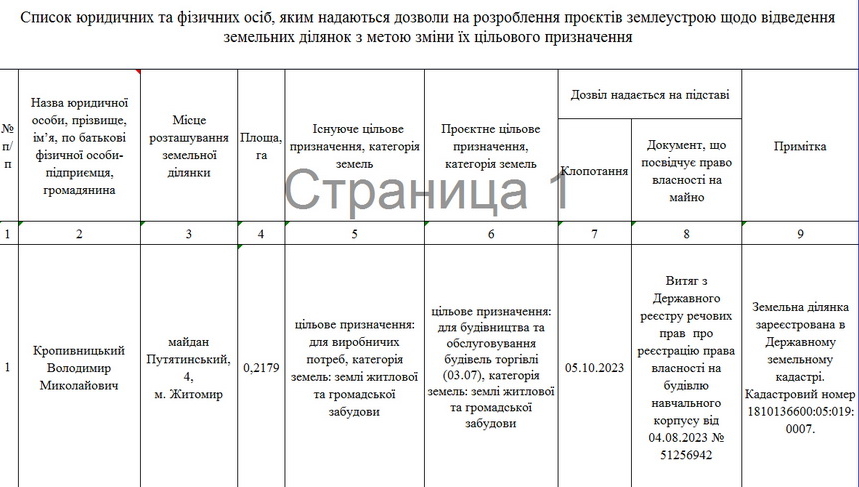 Саме в додатку 2 є інформація про клопотання від 5 жовтня 2023 року фізичної особи Кропивницького Володимира Миколайовича щодо зміни цільового призначення земельної ділянки площею 0,2179 га на майдані Путятинському, 4: існуюче цільове призначення – «для виробничих потреб», нове цільове призначення – «для будівництва та обслуговування будівель торгівлі».
