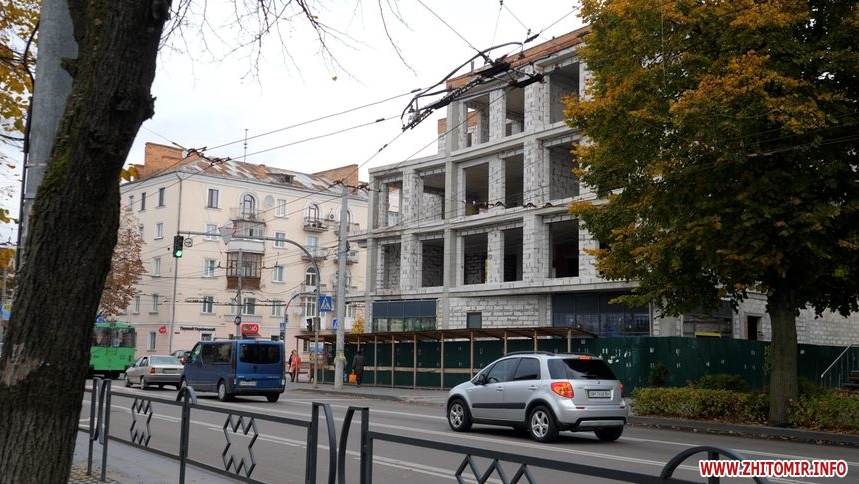 У Житомирі, на розі вулиць Київської та Театральної, продовжують зводити будівлю. Тут є чотири поверхи, де вже встановлюють вікна. На початку вересня мер Житомира Сергій Сухомлин заявив, що дозвільних документів у забудовника немає, тому питання будуть вирішувати через суд.