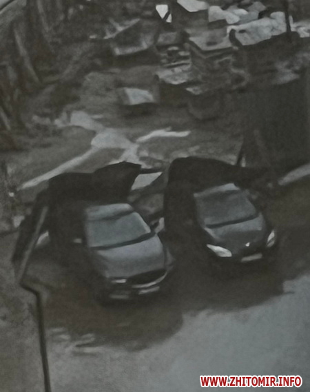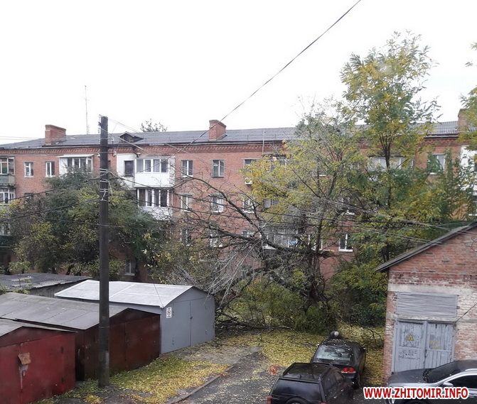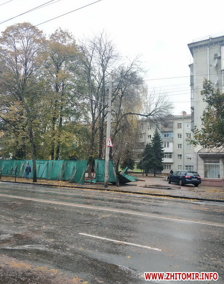 Читачі повідомляють, що у Житомирі на території ЖК «Гранд Сіті Домбровський» паркан упав на припарковані автомобілі, а по місту чимало повалених дерев.