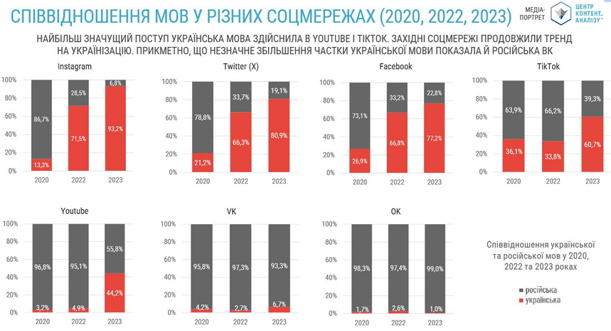 «Таким чином, користувачі трьох названих соціальних мереж вже протягом півтора року перебувають в здебільшого україномовному середовищі, що створює сприятливі умови для переходу на українську мову тих, хто ще надає перевагу російській мові. Вочевидь, тенденція на збільшення частки української мови продовжиться, хоч, можливо, скромнішими темпами. Ключовою новиною є те, що радикальний прогрес продемонстрував за останній рік Youtube. Дослідження, зроблене в червні 2022 року, не виявило змін в цій соціальній мережі порівняно з довоєнним періодом. Проте майже півтора року по тому можна констатувати, що крига скресла й українська мова відчутно посилила свої позиції, відірвавшись від ганебних 5% матеріалів й сягнувши майже половини (45%). Вдвічі зросла частка української мови і в ТіkTok: якщо раніше співвідношення було 1 до 2 на користь російської мови, то тепер 2 до 1 на користь державної», - йдеться у дослідженні.