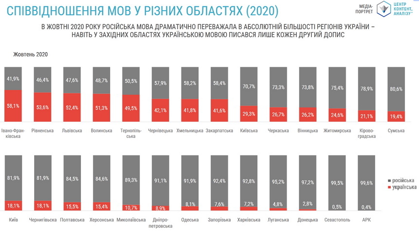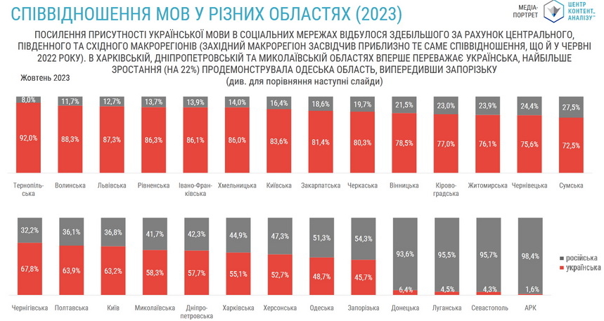 Наводяться й дані щодо української мови в соцмережах різних областей України: якщо у 2020 році більш ніж 50% було лише у чотирьох регіонах (Івано-Франківська, Рівненська, Львівська, Волинська області), то з 2022 року відсоткове співвідношення значно покращилося на користь української.