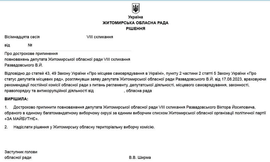 Текст від попередніх аналогічних проєктів рішень сесії відрізняється лише датою заяви депутата про припинення повноважень: цього разу Развадовський написав заяву 17 серпня 2023 року – наступного дня після чергової сесії облради, де не вистачило голосів за дострокове припинення його повноважень.