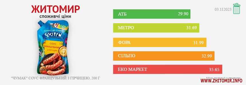 Моніторинг здійснено на основі інформації, отриманої за методом контрольної закупки 03.11.2023 р. у місцях продажу: АТБ, пр. Миру, 15 А, Фора, вул. Лятошинського, , Метро, вул. Ватутіна, 55-в, Сільпо, пл. Житній ринок, 1, Еко Маркет, вул. М. Бердичівська, 2/7