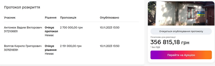 Стартова ціна була 356 тис. 815,18 грн, на торги подали заявки 16 учасників, за результатами трьох раундів аукціону переможцем став Антонюк Вадим Вікторович з пропозицією 2,7 млн грн, що у 7,6 раза більше від початкової ціни.