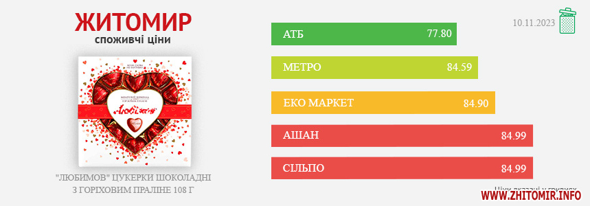 Моніторинг здійснено на основі інформації, отриманої за методом контрольної закупки 10.11.2023 р. у місцях продажу: АТБ, пр. Миру, 15 А, Ашан, вул. Київська, 77, Метро, вул. Ватутіна, 55-в, Сільпо, пл. Житній ринок, 1, Еко Маркет, вул. М. Бердичівська, 2/7