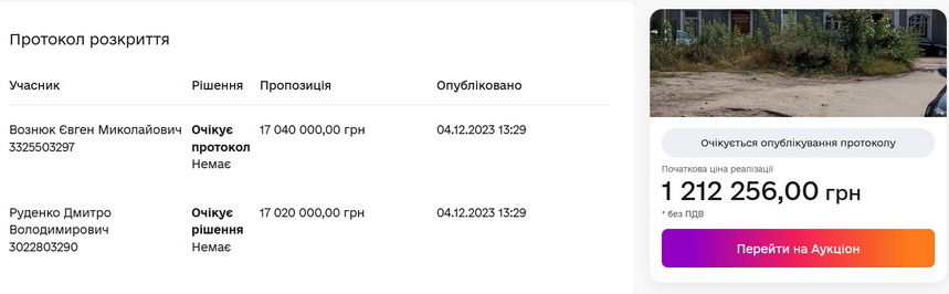 Цього разу заявки на торги подали сім учасників, під час трьох раундів аукціону вартість нерухомості збільшилася майже в 17 разів – до 17 млн грн. Найбільше за комплекс будівель з гаражами запропонував 32-річний підприємець з Житомира Вознюк Євген Миколайович – 17 млн 040 тис. грн. В оприлюдненому протоколі електронних торгів зазначено, що переможець з урахуванням ПДВ має сплатити 20 млн 448 тис. грн.