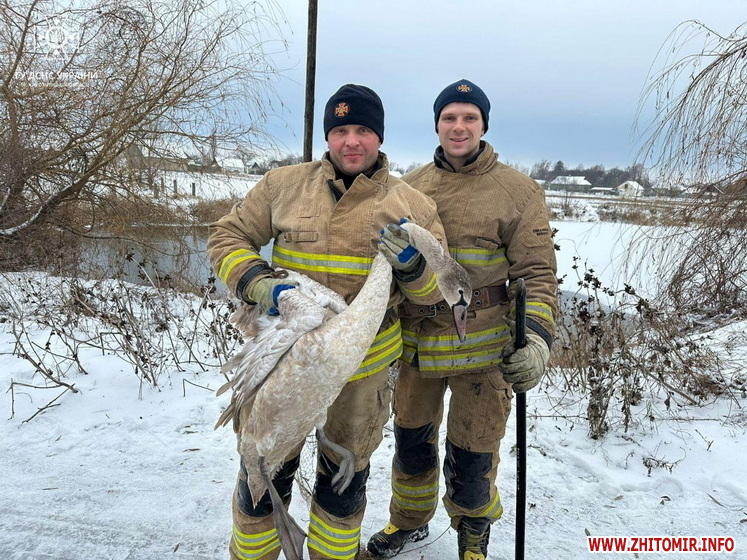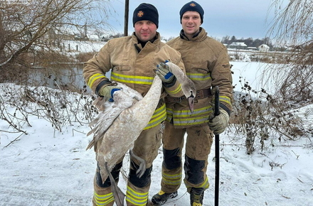 «Рятувальники визволили із крижаного полону лебедя. До Державної пожежно-рятувальної частини міста Коростишів надійшло повідомлення про те, що в селі Кропивня на ставку плаває лебідь. Пониження температури загрожувало птахові загибеллю. Бійці ДСНС за допомогою сітки та човна врятували лебедя зі ставка. У нього виявилося зламаним праве крило, тому він не міг злетіти. Після порятунку птаха доправили на фермеру, де він зимуватиме до весни», - повідомляє ДСНС.