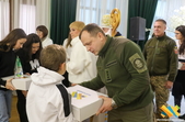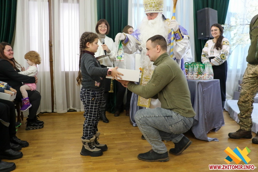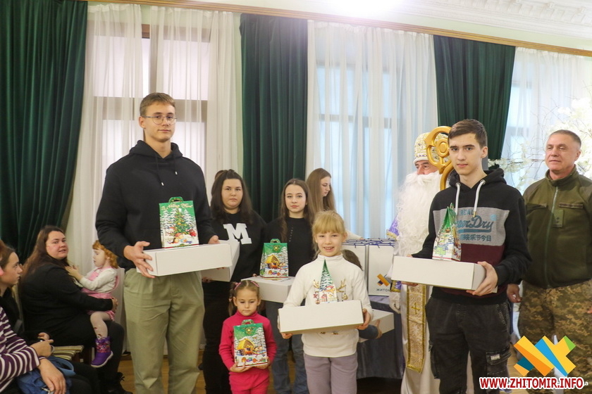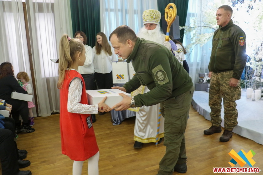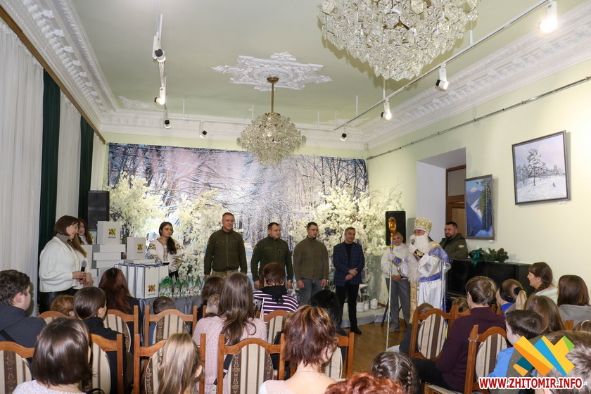 У День Збройних Сил України у Житомирі Святий Миколай передав дітям загиблих військовослужбовців іменні подарунки та солодощі.