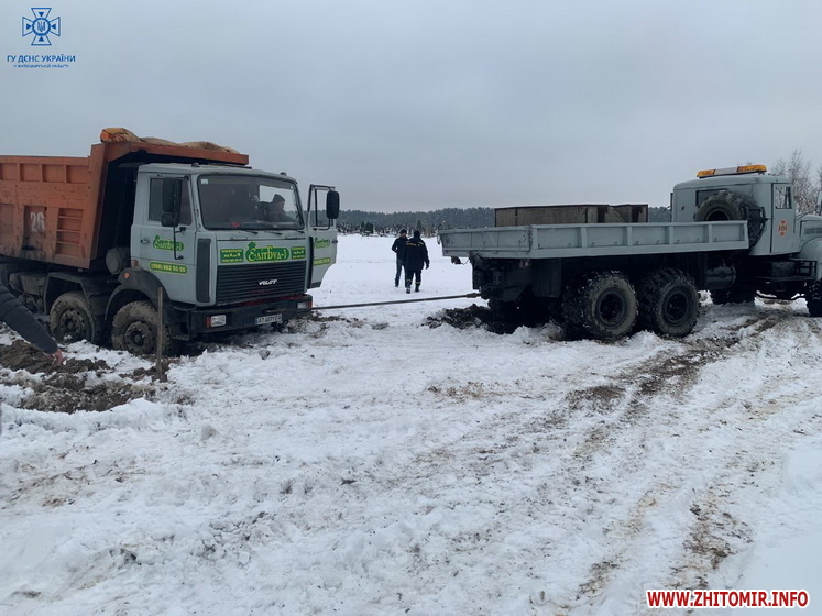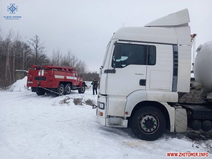 «6 грудня о 13:38 до Служби порятунку «101» надійшла інформація про те, що на дорозі поблизу с. Поромівка Хорошівської територіальної громади Житомирського району через ожеледицю потрапила у сніговий замет та застрягла там вантажівка «MAN». За допомогою пожежного автомобіля та буксировочного троса рятувальники витягли автівку на розчищену ділянку дороги», - йдеться у повідомленні.