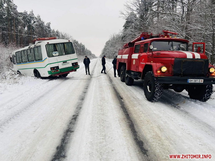 «Олевські рятувальники допомогли відбуксирувати рейсовий автобус. Подія сталась на одному з автошляхів в Олевській громаді. Водій даного транспортного засобу через складні погодні умови не впорався з керуванням та допустив з’їзд в кювет», - йдеться у повідомленні.