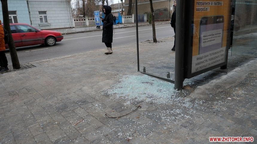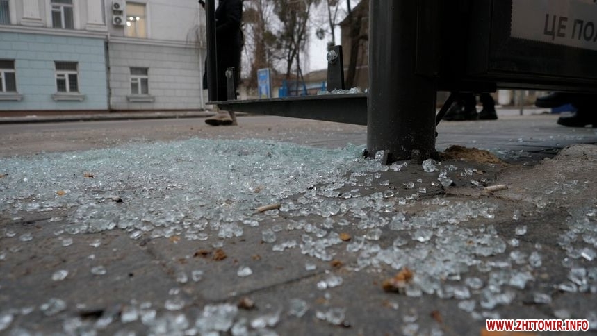 У Житомирі на кількох вулицях можна побачити зупинки громадського транспорту з побитим склом. Зокрема пошкоджені зупинки на вул. Грушевського 4 та Перемоги 12.