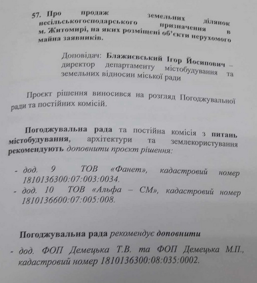Після цього слово взяв голова земельної комісії Микола Янушевич, який запропонував доповнити проєкт рішення дозволами на продаж ще трьох земельних ділянок: ГО «Художня майстерня», ФОП Зайцева майдан Визволення, 7 і ТДВ «Житомирський завод скловиробів».