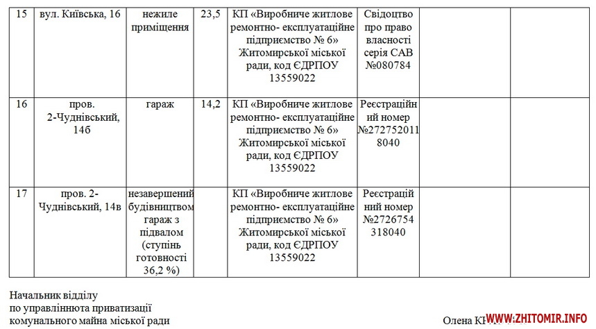 31 липня продали три об’єкти малої приватизації: два приміщення на вул. Лесі Українки, 43-а викупила мати депутата міської ради Андрія Умінського – 169,2 кв.м за 2 млн 585 тис. 206,8 грн (15 тис. 279 грн за 1 кв.м), 170,2 кв.м за 1 млн 148 тис. 850 грн (6 тис. 750 грн за 1 кв.м); колишню аптеку на вул. Велика Бердичівська, 47 площею 138,7 кв.м приватизувало пов’язане з родиною депутатів Онопрієнко ПрАТ «Житомирський комбінат силікатних виробів» за 3 млн 921 тис. 492 грн (28 тис. 273 грн за 1 кв.м);
