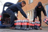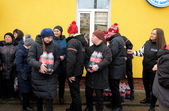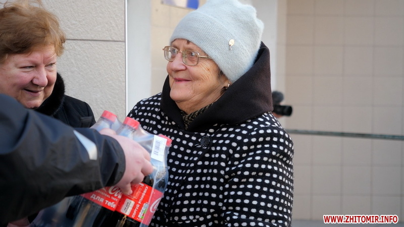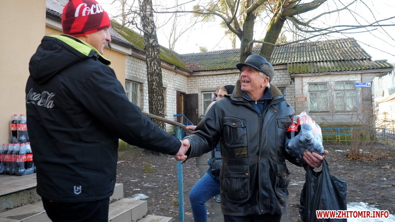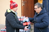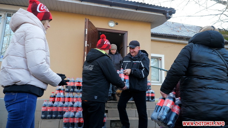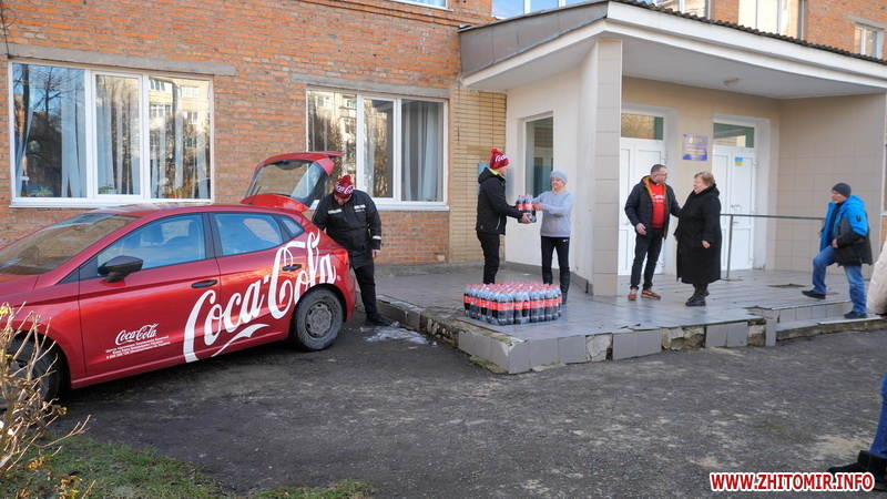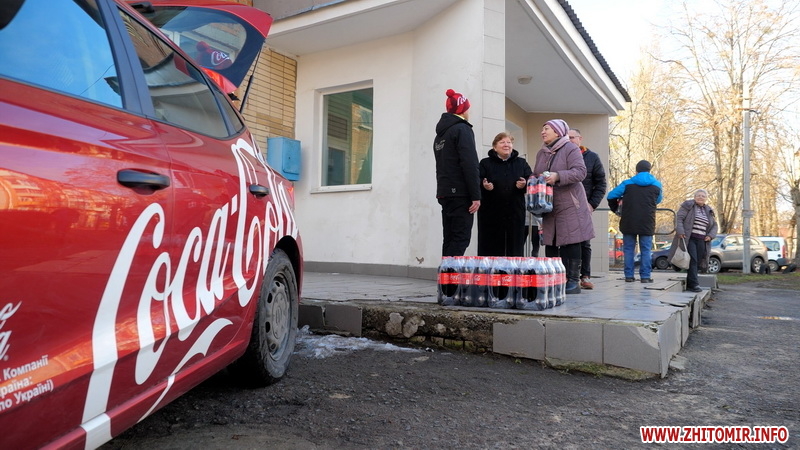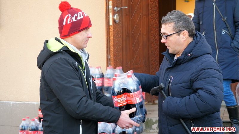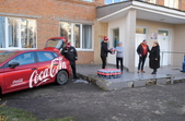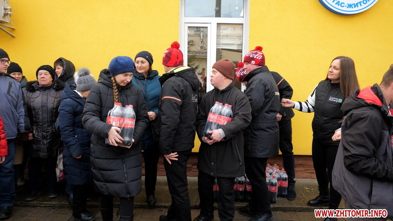 2000 пляшок святкового столу родинам вразливих категорій у Житомирі передали волонтери Кока-Кола разом з представника благодійного фонду «Карітас».
