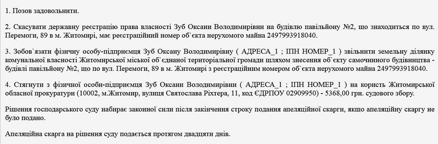 Нагадаємо, два павільйони, знесення яких вимагала прокуратура, знаходяться на земельній ділянці площею 0,02 га по вул. Перемоги, 89 і належать Тетяні Бабкіній та Оксані Зуб. Рішення, про які йдеться у повідомленні прокуратури, були ухвалені Господарським судом Житомирської області 13 грудня 2023 року і оприлюднені 21 грудня. Крім знесення павільйонів жінки також мають заплатити на користь прокуратури по 5368 грн судового збору.