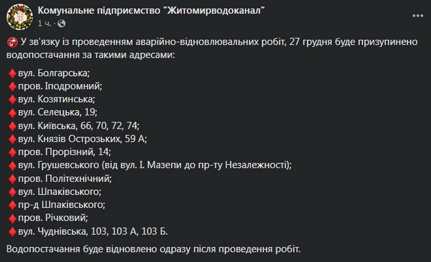 Через аварійно-відновлювальні роботи у різних частинах Житомира 27 грудня не буде води.