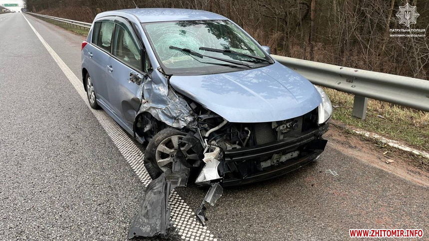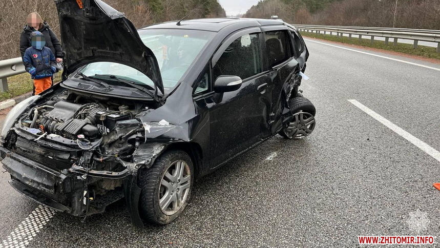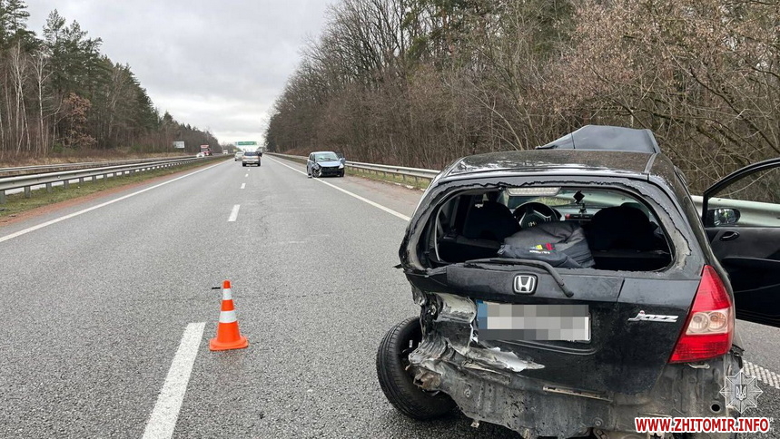 «У зв’язку з дорожньо-транспортною пригодою з потерпілими, що сталася сьогодні, близько 10-ї години ранку, на 124 км автомобільної дороги Київ — Чоп (поблизу села Березина, Житомирської області) за участю автомобілів Honda та Nissan, рух транспорту на місці пригоди, у напрямку міста Житомир, здійснюється лівою смугою/На місці події працюють всі відповідні служби», - йдеться в повідомленні.