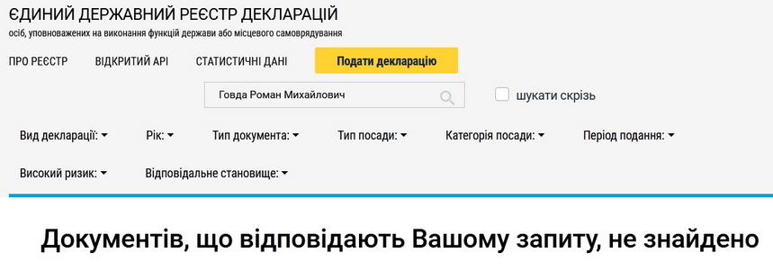 Інформація про декларації заступника керівника Житомирської обласної прокуратури Романа Говди, який був призначений на цю посаду 6 жовтня 2022 року, вилучена з публічного доступу.