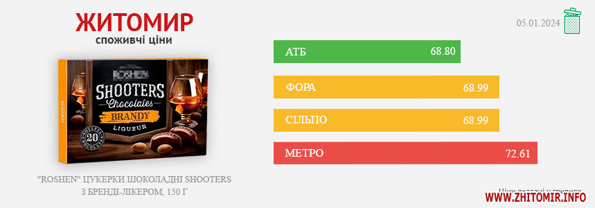 Моніторинг здійснено на основі інформації, отриманої за методом контрольної закупки 05.01.2024 р. у місцях продажу: АТБ, пр. Миру, 15 А, Фора, вул. Лятошинського, 2, Метро, вул. Ватутіна, 55-в, Сільпо, пл. Житній ринок, 1