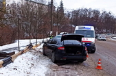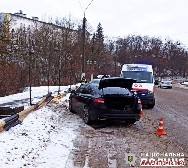 «Подія сталася 18 січня близько 08:25 по вулиці Троянівській в обласному центрі. Попередньо, 31-річна житомирянка, рухаючись за кермом автомобіля «Ford» у напрямку вулиці Героїв Пожежних, здійснила зіткнення з колесовідбійником. Внаслідок ДТП отримали травми двоє пасажирів легковика, діти 8 й 10 років. Їх було доставлено до лікувального закладу.