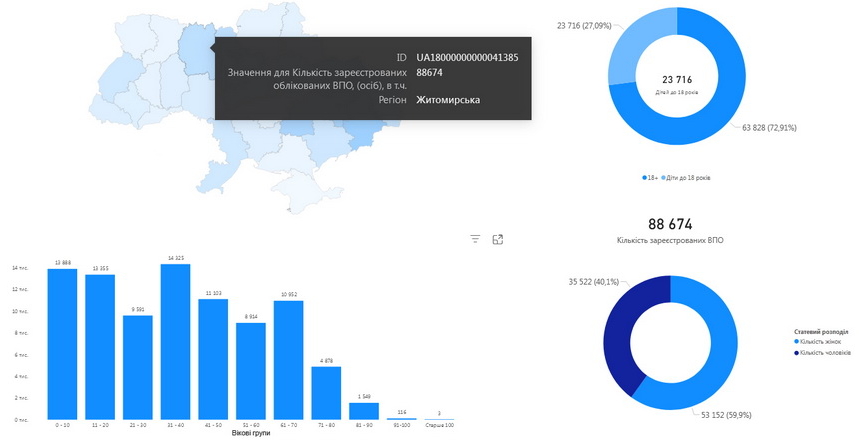 Щодо даних по Житомирській області, то з 88 тис. 674 зареєстрованих ВПО, 23 тис. 716 – діти до 18 років, майже 60% - жінки. Щодо вікових груп, то найбільша (14 тис. 325) – віком 31-40 років, осіб старше 60 років – 17 тис. 498. Серед внутрішньопереміщених осіб, які зареєструвалися у Житомирській області, є 2 тис. 111 осіб з інвалідністю (дітей та дорослих) та 114 багатодітних родин.