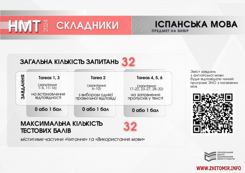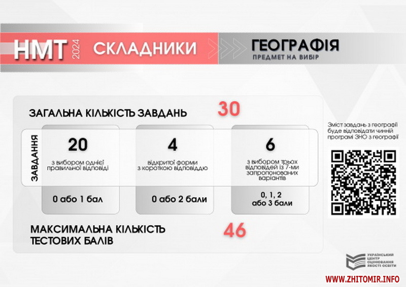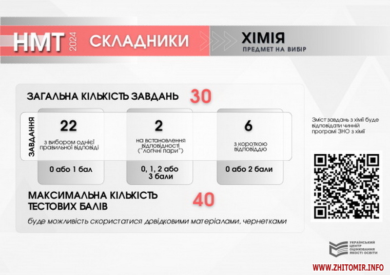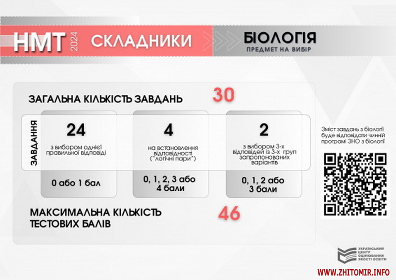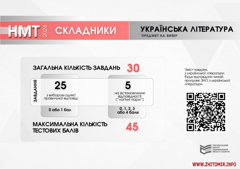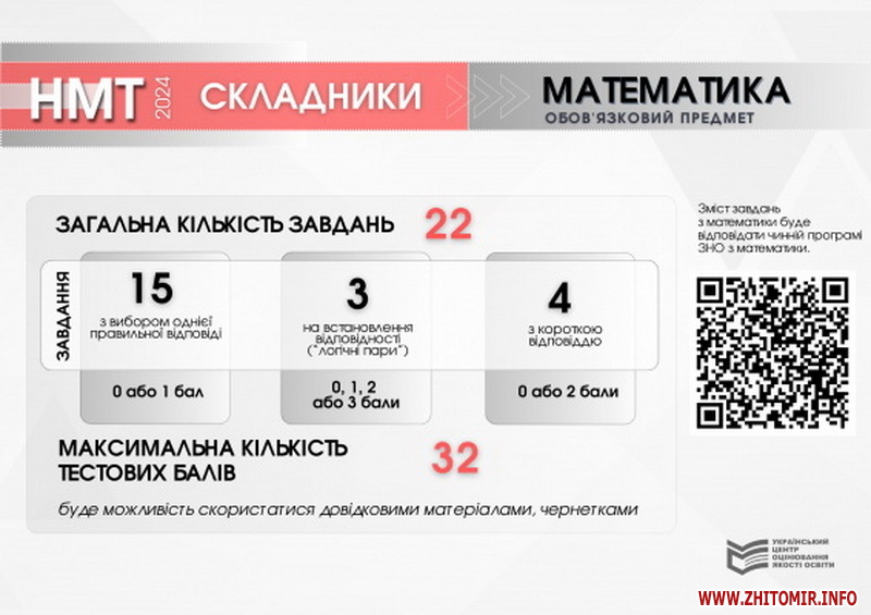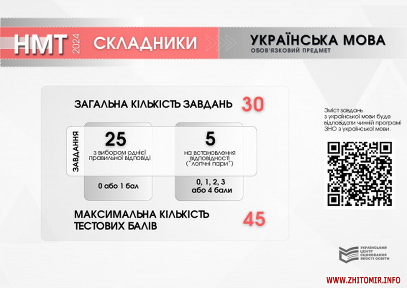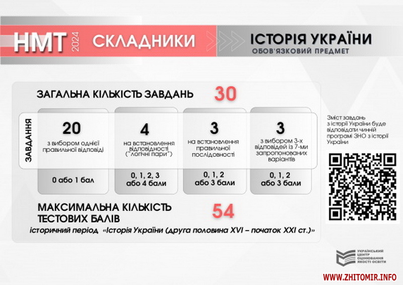 Як повідомляв Житомир.info, 14 листопада 2023 року у департаменті освіти Житомирської міської ради розповіли про особливості НМТ, який складатимуть випускники у 2024 році. Обов'язковими предметами будуть українська мова, математика, історія України.