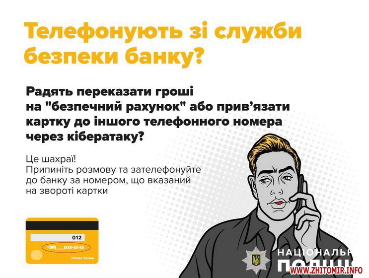 Як повідомляв Житомир.info, 20 січня 2024 року поліція інформувала, що до них звернулась 62-річна місцева жителька з повідомленням про ошуканство. Жінка розповіла, що нещодавно до неї зателефонував незнайомець та, назвавши останні 4 цифри банківської картки заявниці, повідомив, що їй необхідно змінити пароль, адже на картку здійснено кібератаку. Вона повірила та надала зловмисникам пін-код свого платіжного засобу. Після цього з картки жінки списало 11 тис. грн.