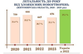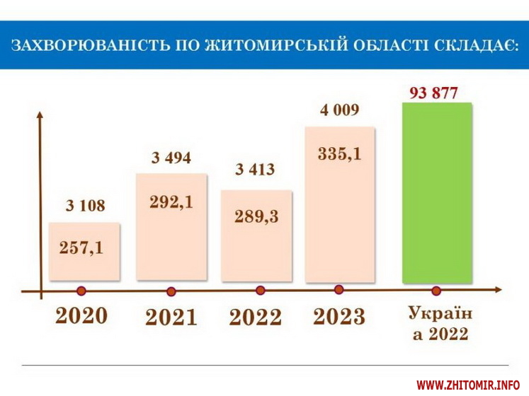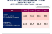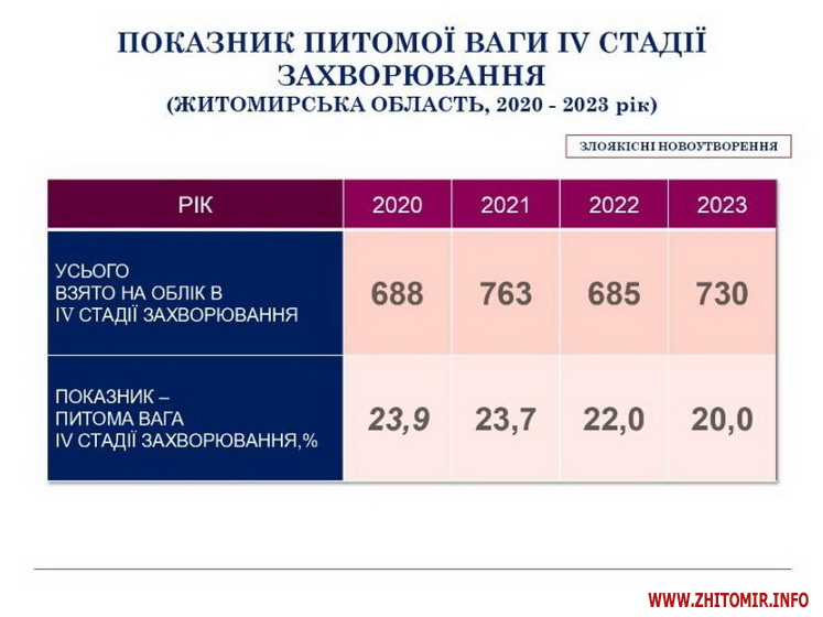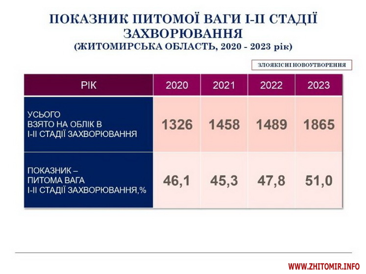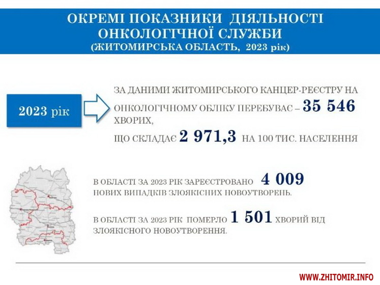 «У Житомирській області на обліку перебуває 35 546 хворих на онкологічні захворювання. У 2023 році було зареєстровано 4 009 нових випадків захворювань, з них майже 20% пацієнтів мали захворювання на останніх стадіях. Рак забрав життя 1 501 пацієнта. Для порівняння у 2022 році на обліку знаходилось 34 891 пацієнт, нових випадків онкозахворювань було 3 413, померло від злоякісних новоутворень 1 429 жителів області», - йдеться у повідомленні.