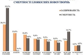 У загальній структурі онкозахворюваності у п’ятірку хвороб, які найчастіше діагностують у пацієнтів, увійшли рак органів травлення – 20,1%, новоутворення шкіри – 13,6%, захворювання жіночих статевих органів -12,4%, рак молочної залози 9,4% та чоловічих статевих органів – 9,2%.