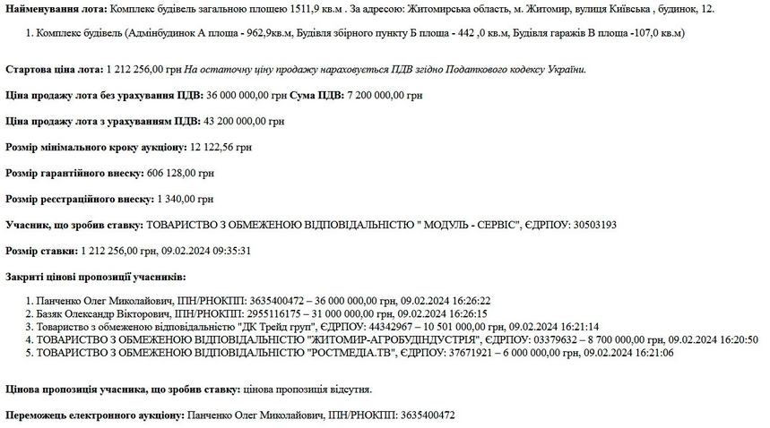 Протоколом від 9 січня 2024 року переможцем аукціону став житомирянин Руденко Дмитро Володимирович з пропозицією 17 млн 020 тис. грн, який мав впродовж 20 днів сплатити за нерухомість 19 млн 594 тис. 642 грн. Але й тут кошти за об’єкт не надійшли і аукціон визнали таким, що не відбувся.