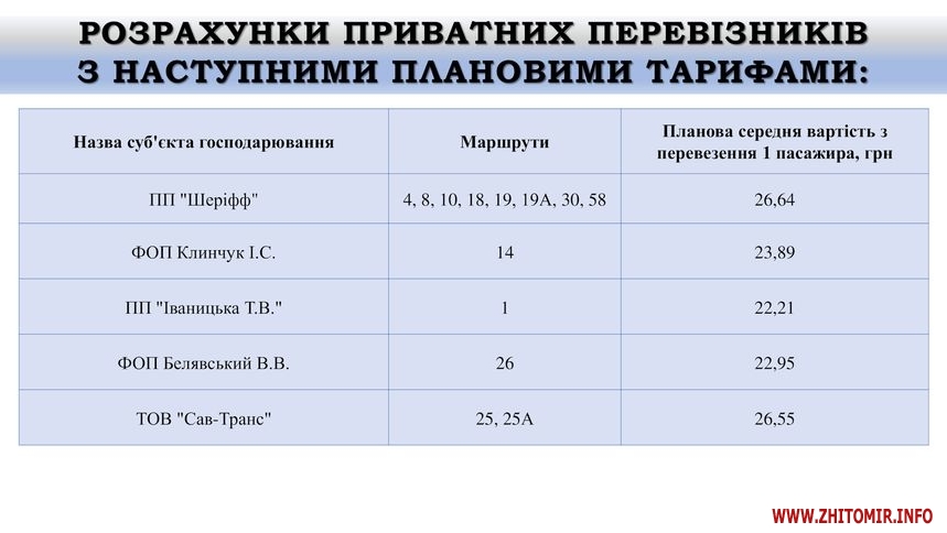 «Як завжди перевізники подають максимальний тариф. Ми, як управління, розуміємо, аналізуючи попередні роки, вони дають максимальний розуміючи те, що зниження буде, бо такий тариф не є допустимим. Максимальні розрахунки надаються – це більш як 20-25 грн. Але ми, як управління транспорту, розуміємо, що платоспроможність наших пасажирів, на жаль, не збільшується і тому шукаємо якийсь баланс, щоб вартість була не більш ніж 15 грн у Житомирі», - говорить в.о. начальника управління транспорту і зв’язку Житомирської міської ради Микола Єрмаков.