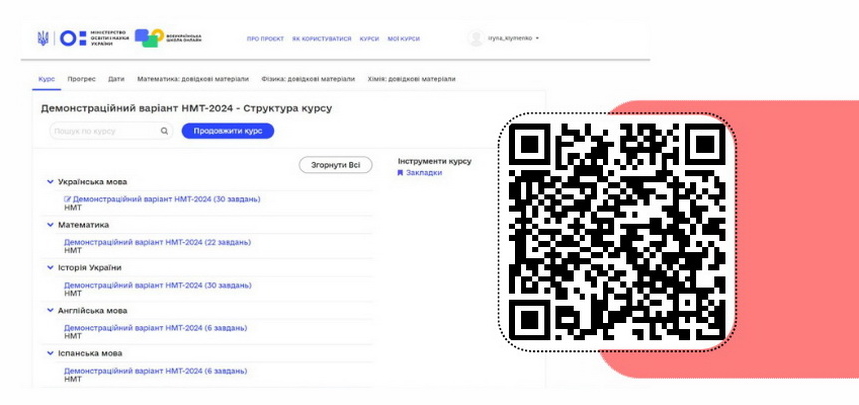 У розділі «Курси» виберіть навчальний курс для 10-го чи 11-го класу, де перейдіть до вкладки «Демонстраційний варіант НМТ-2024». У цій вкладці натисніть «Переглянути курс», а потім — «Зареєструйтеся», у такий спосіб ви отримаєте повний доступ до курсу для перегляду й виконання тестових завдань.