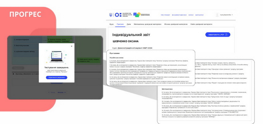 Після завершення роботи, ви зможете переглянути індивідуальний звіт про свої успіхи, звернувшись до закладки «Прогрес». Тут ви дізнаєтеся, скільки тестових балів вам удалося набрати з максимально можливих за виконання завдань з кожного предмета НМТ, у яких завданнях ви припустилися помилок і яку тему вам варто повторити або доопрацювати, щоб надолужити прогалини.