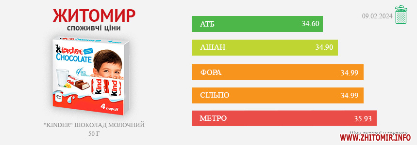 Моніторинг здійснено на основі інформації, отриманої за методом контрольної закупки 09.02.2024 р. у місцях продажу: АТБ, пр. Миру, 15 А, Фора, вул. Лятошинського, 2, Метро, вул. Ватутіна, 55-в, Сільпо, пл. Житній ринок, 1, Ашан, вул. Київська, 77