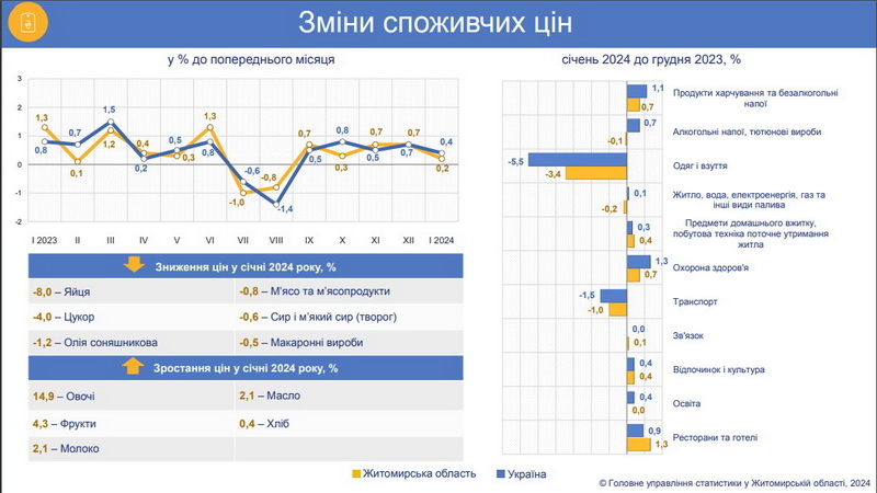 На споживчому ринку Житомирської області у січні порівняно з груднем ціни на продукти та безалкогольні напої зросли на 1,1%.